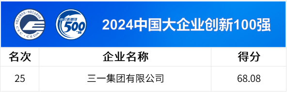 “2024中国大企业创新100强”依据对2023年企业研发投入强度、研发费用、发明专利数、非发明专利数、收入利润率等作为评价指标计算综合得分排序产生。三一集团始终将研发创新视为事业发展的第一推动力,研发投入大、创新成果丰硕,在榜单中位列第25名。