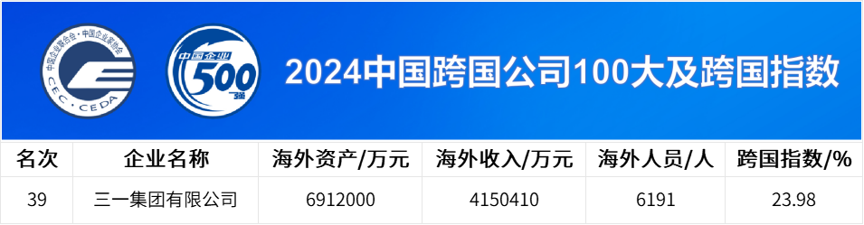 在“2024中国跨国公司100大及跨国指数”中,三一集团位列第39名。当前,三一集团正全力推进全球化战略,通过全球化的资源配置,进一步推动本土化,更好地满足全球客户需求,国际市场保持强劲增长。