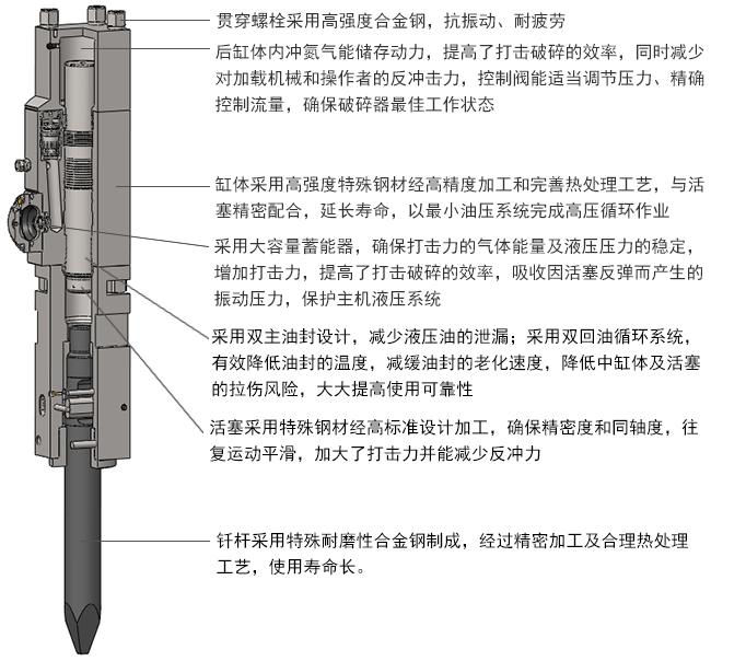 破碎器技术先进性一(1)壳体销轴采用高强度合金钢并经过完善的热处理热处理工艺, 销轴强度和耐磨性显著提高, 使用寿命明显增长。(2)外壳采用Q345B制造,为矿山型加强壳体,适用恶劣工况 (3)大型破碎锤壳体螺栓采用高强度合金钢制成,并采用10支壳体螺栓设计,保证主机和外壳紧密结合,提高了使用的可靠性(4)外壳磨损部位采用高强合金耐磨材料,使其更耐磨,更具有保护性